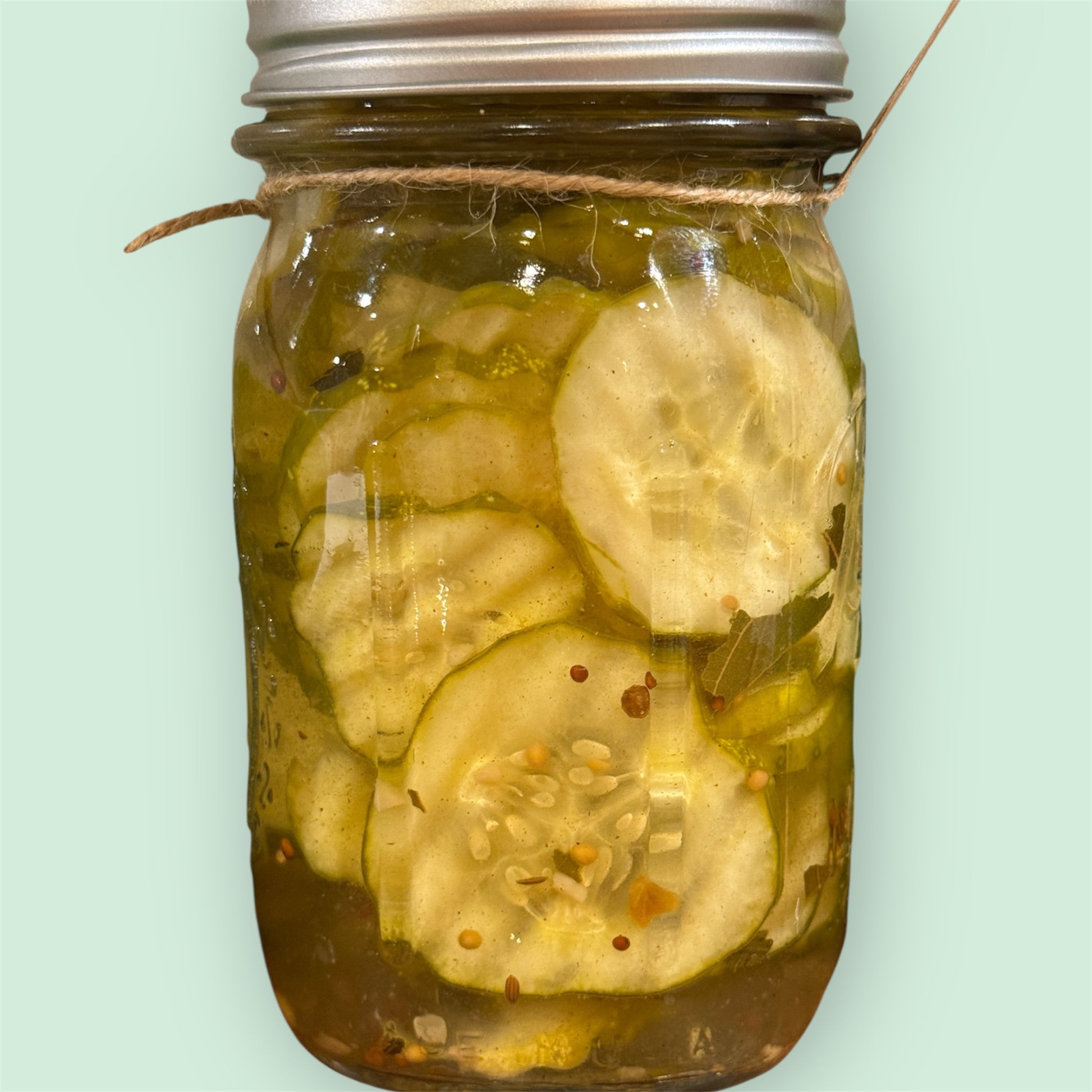 One pint of InterRooted Kitchen's Sweet & Tangy Pickles made with organic cucumbers from Biver Farms.